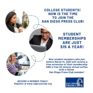 • Free 45-minute virtual coffee with a San Diego Press Club member, a media or PR/communications professional who is aligned with your studies or interest.